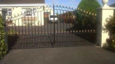 Each blade stands 8 feet above grade, set in concrete 3 feet below, weighs 80-90 pounds and is 5/8 inch thick . The profile of the blades is an irregular trapezoid with no horizontal connections or supports . Only the gate has two horizontal bars, and each leaf weighs 1200 pounds . Сохранить фото . Contemporary Landscape .