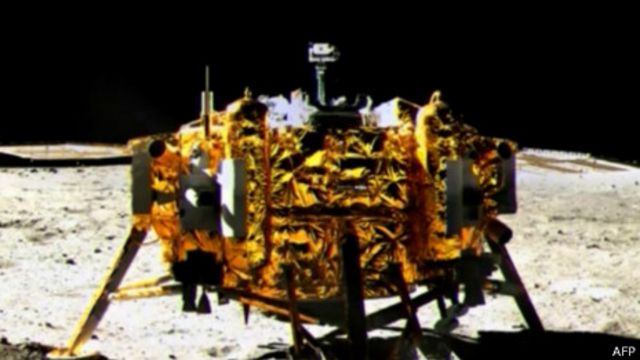 Первый запущенный луноход за последние сорок лет, «Нефритовый заяц», после успешной посадки начал отправлять на Землю первые снимки . На первой фотографии изображен космический аппарат «Чанъэ-3», доставивший луноход на Луну .