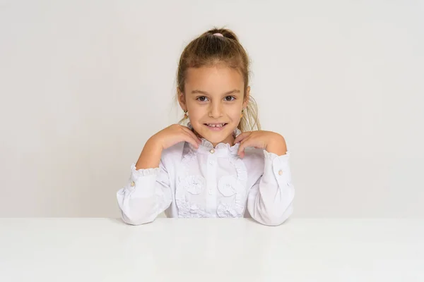 Портрет счастливой милой кудрявой девочки, стоящей и позирующей на белом фоне — Фото автора Vadymvdrobot . Автор Vadymvdrobot Depositphotos .