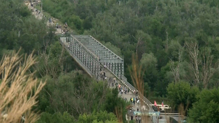 Сегодня мост в Станице Луганской через реку Северский Донец на линии разграничения начал функционировать, на открытии присутствовал президент Владимир Зеленский .