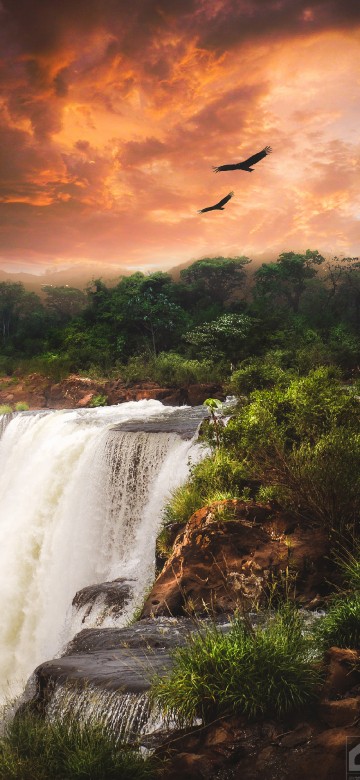Со своего фото ; . . . Низвергающийся бурным потоком водопад на фоне яркой зелени тропического леса и красоты гор, создаст ощущение свежести в вашем доме . . . . Обои с изображением водопада . . .