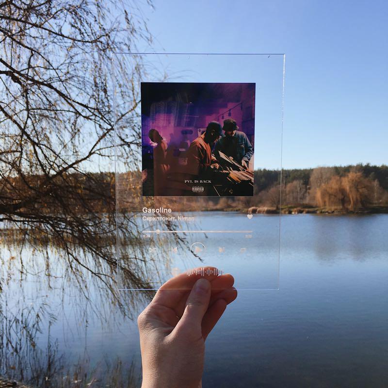 Заказать трек на стекле Spotify Glass в подарок: печать фото обложки песни на оргстекле с подставкой . Стеклянные музыкальные альбомы в СПб .