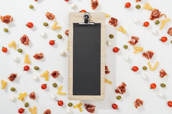 Белый буфер обмена среди оливок, прошутто, зелени . . .
