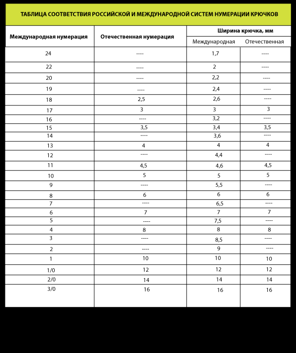 Размеры крючков для рыбалки таблица