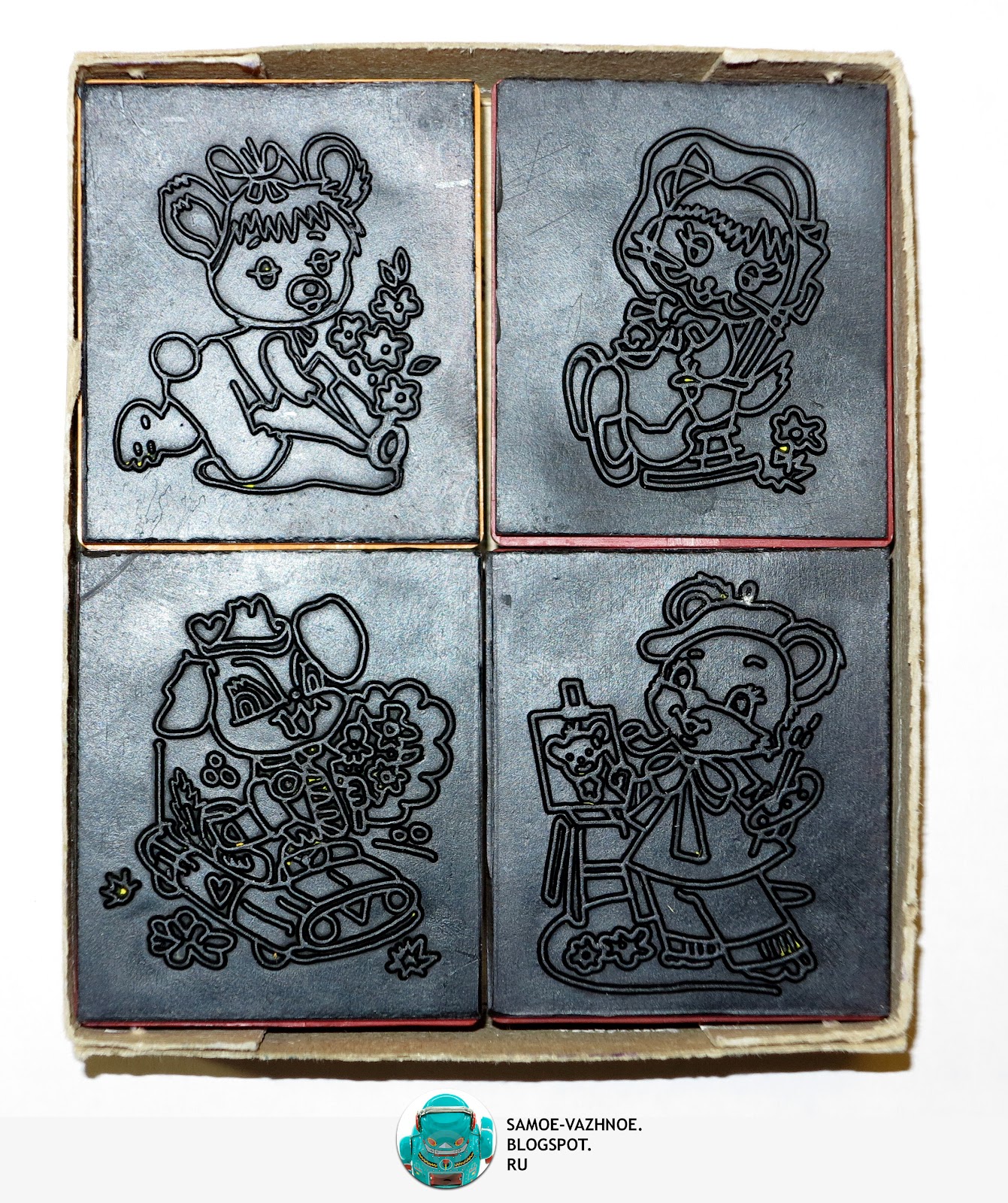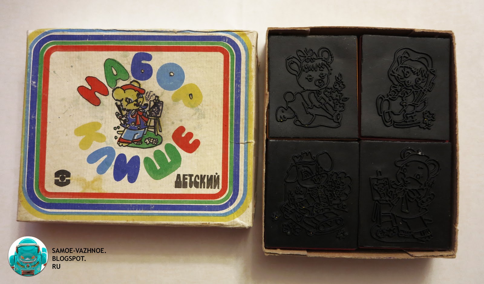 Набор детских штампом/ штемпелей/ печатей СССР . Коробка размер 19*13 см, штампы 6*4 см . В наличии 7 штампов, коробка и 3 оригинальные картинки .