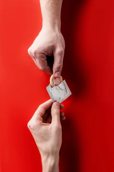 Обрезанное изображение улыбающейся привлекательной девушки с красными лепестками роз в руках, изолированных на белом . Селективное внимание веселой девушки, смотрящей на красную розу в руке бойфренда, сидящего в ресторане . Женщина держит соль для ванной в руках .