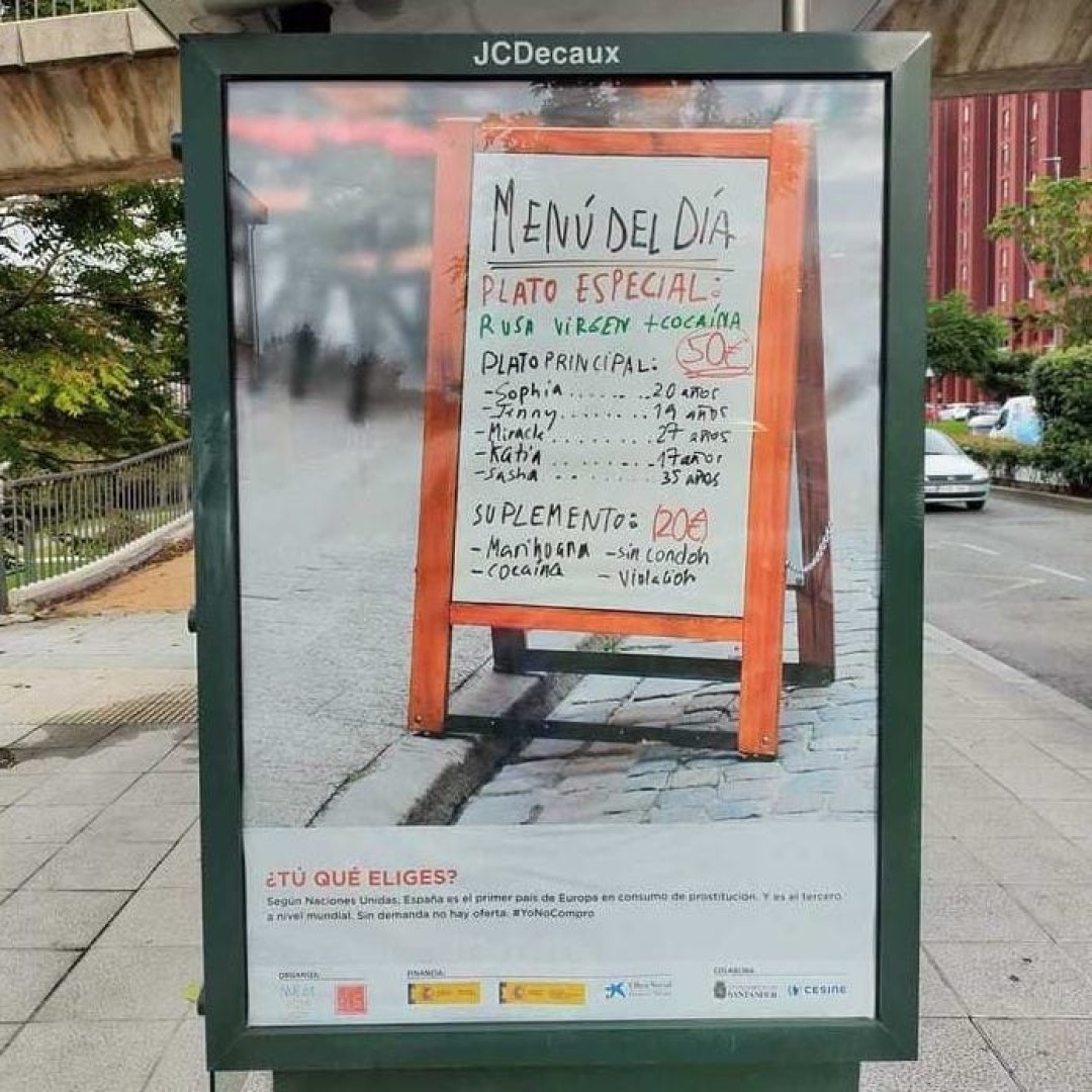 Посольство России в Испании потребовало убрать социальную рекламу о проблеме проституции с изображением «меню», в котором вместо блюд предлагаются «русские девственницы» и кокаин .