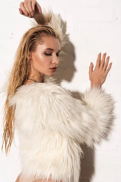 Сексуальная девушка с мокрыми волосами в белом искусственном шубе на белом фоне . Блондинка с мокрыми волосами изолирована на сером . Улыбающаяся девушка вытирая влажные чистые волосы . . .