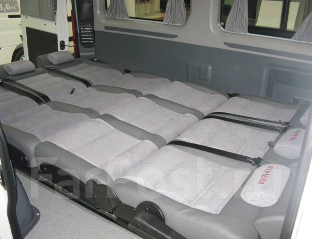 Техместный диван-трансформер в минивэне оснащен 3-мя 3х точечными ремнями безопасности, подголовниками, подъемным сидением, подушечки подголовные .