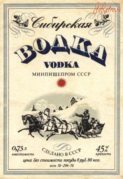 Водка "Сибирская" крепостью 45% Наверное, одной из наиболее любопытных марок водки выпускавшихся Советская водка в наше время - фото из открытых источников сети Интернет .