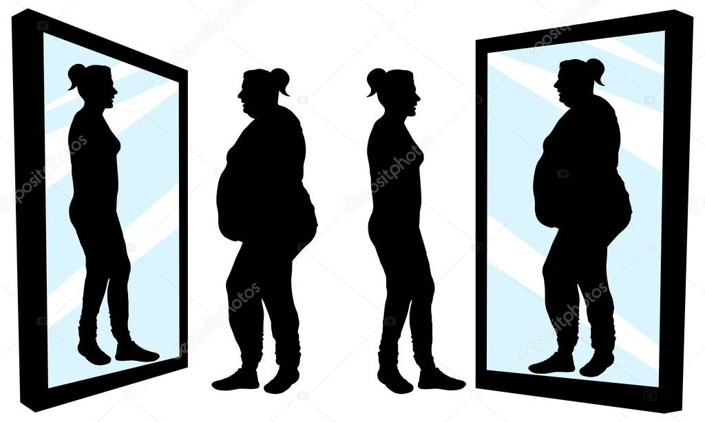 Толстая женщина видит себя в зеркале стройную девочку Толстые и худые мужчины с разным питанием Фон