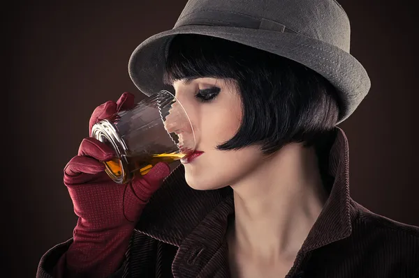 Виски девушки: cтоковые фотографии, картинки, лицензионные изображения высокого разрешения . ersler Высокий ключевой портрет молодой женщины с коктейлем в многоцветных задних фонарях .