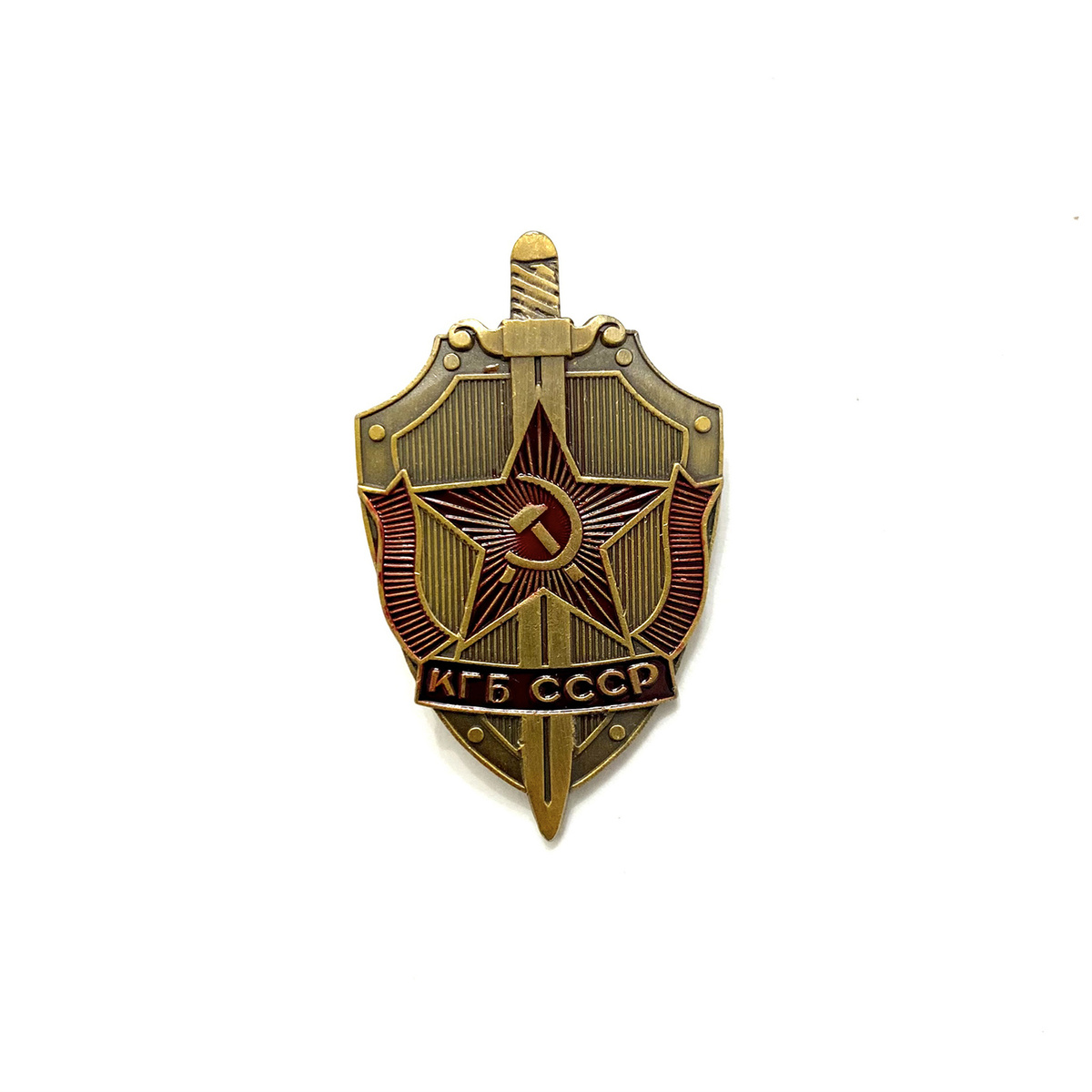 Нагрудный знак КГБ СССР представляет собой щит с красной пятиконечной звездой в центре, вертикально вниз отпущен меч, на ленте красной написано: "КГБ СССР", закрутка винтовая .