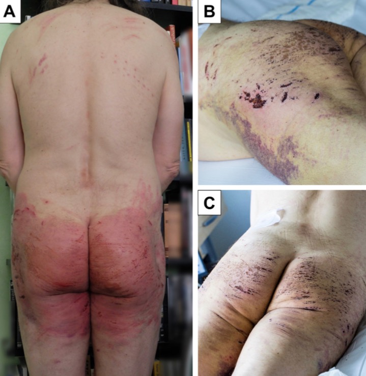 Клиническое течение ссадин и гематом после БДСМ игры. (А) Заметная эритема, гематома и ссадины через 1 день после вечеринки, то есть за 2 дня до поступления (снимок сделан пациентом). ((B) и (C) Заживление ссадин и рассасывание гематомы заметны на 6-й день после события (т.е. на 3-й день после поступления).