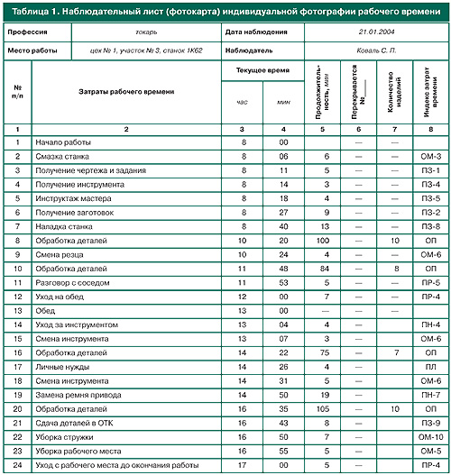 Если фотография рабочего времени применяется для разработки норм времени, то объектами Смена началась в 8:00 . Токарь начал день со смазки станка (колонка 2), которую закончил в 8:06 (колонки 3 и 4) . Затем до 8:11 он получал производственное задание и чертеж . . .