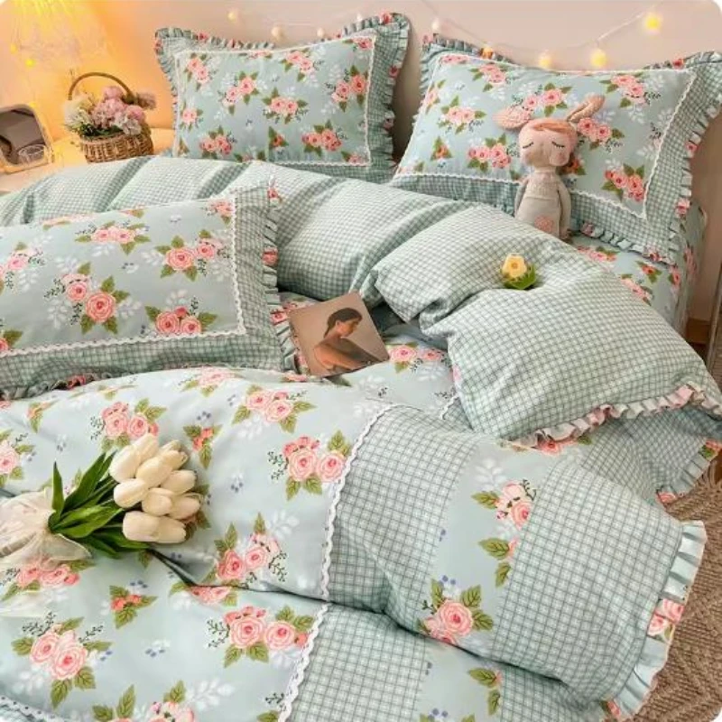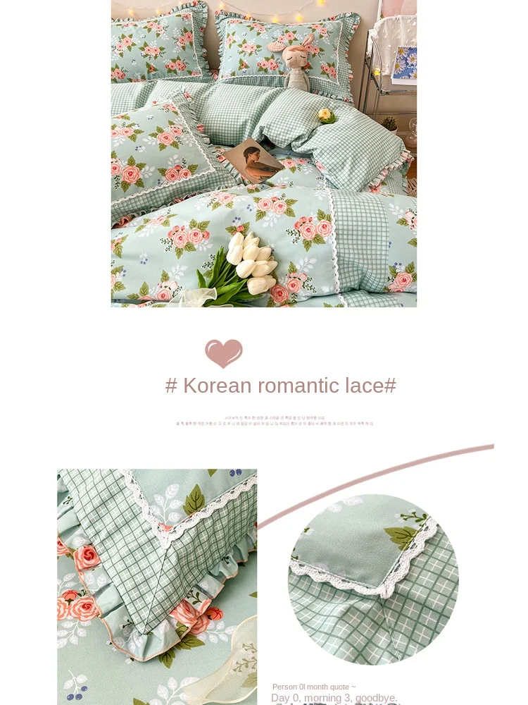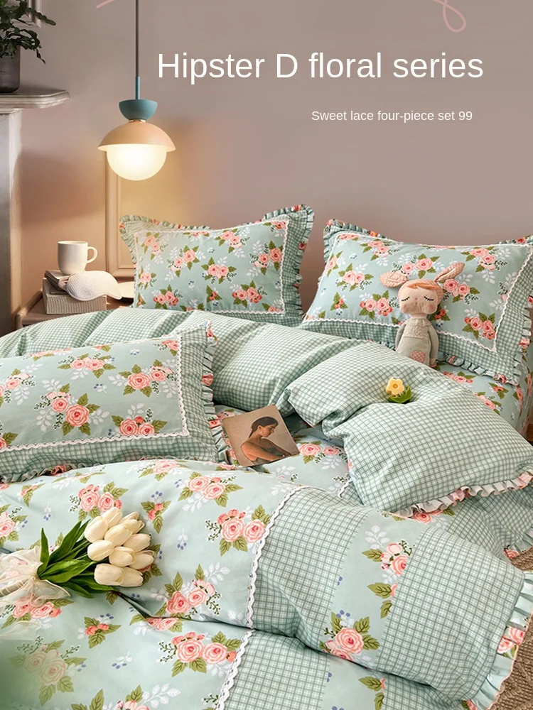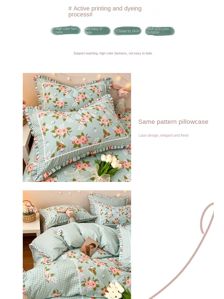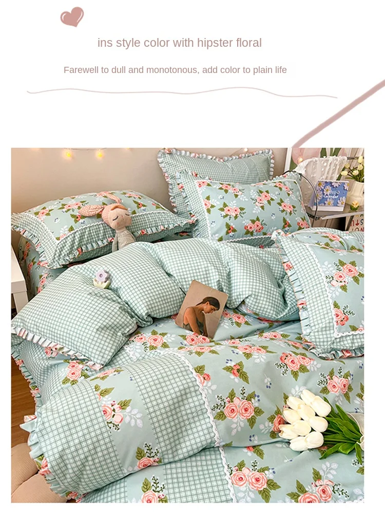 Four-Piece Polyester Flower Printing and Dyeing Lace Ruffled Simple Household Washed Cotton Fitted Sheet 1.8M Quilt CoverBedding - Купить с бесплатной доставкой