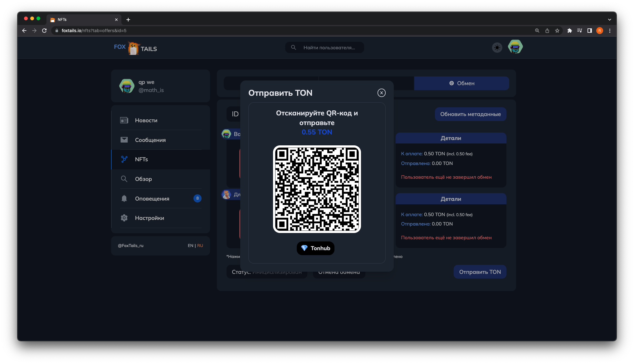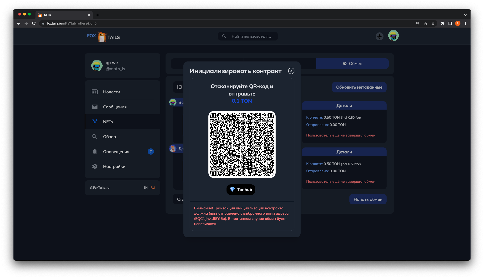 8. ΠΠ°ΠΆΠΌΠΈΡΠ΅ Π½Π° ΠΊΠ½ΠΎΠΏΠΊΡ ΠΠ°ΡΠ°ΡΡ ΠΎΠ±ΠΌΠ΅Π½ ΠΈ ΠΈΠ½ΠΈΡΠΈΠ°Π»ΠΈΠ·ΠΈΡΡΠΉΡΠ΅ ΠΊΠΎΠ½ΡΡΠ°ΠΊΡ, ΠΎΡΠΏΡΠ°Π²ΠΈΠ² ΡΡΠ°Π½Π·Π°ΠΊΡΠΈΡ ΡΠ΅ΡΠ΅Π· QR ΠΊΠΎΠ΄ ΠΈΠ»ΠΈ ΠΊΠ½ΠΎΠΏΠΊΡ.
