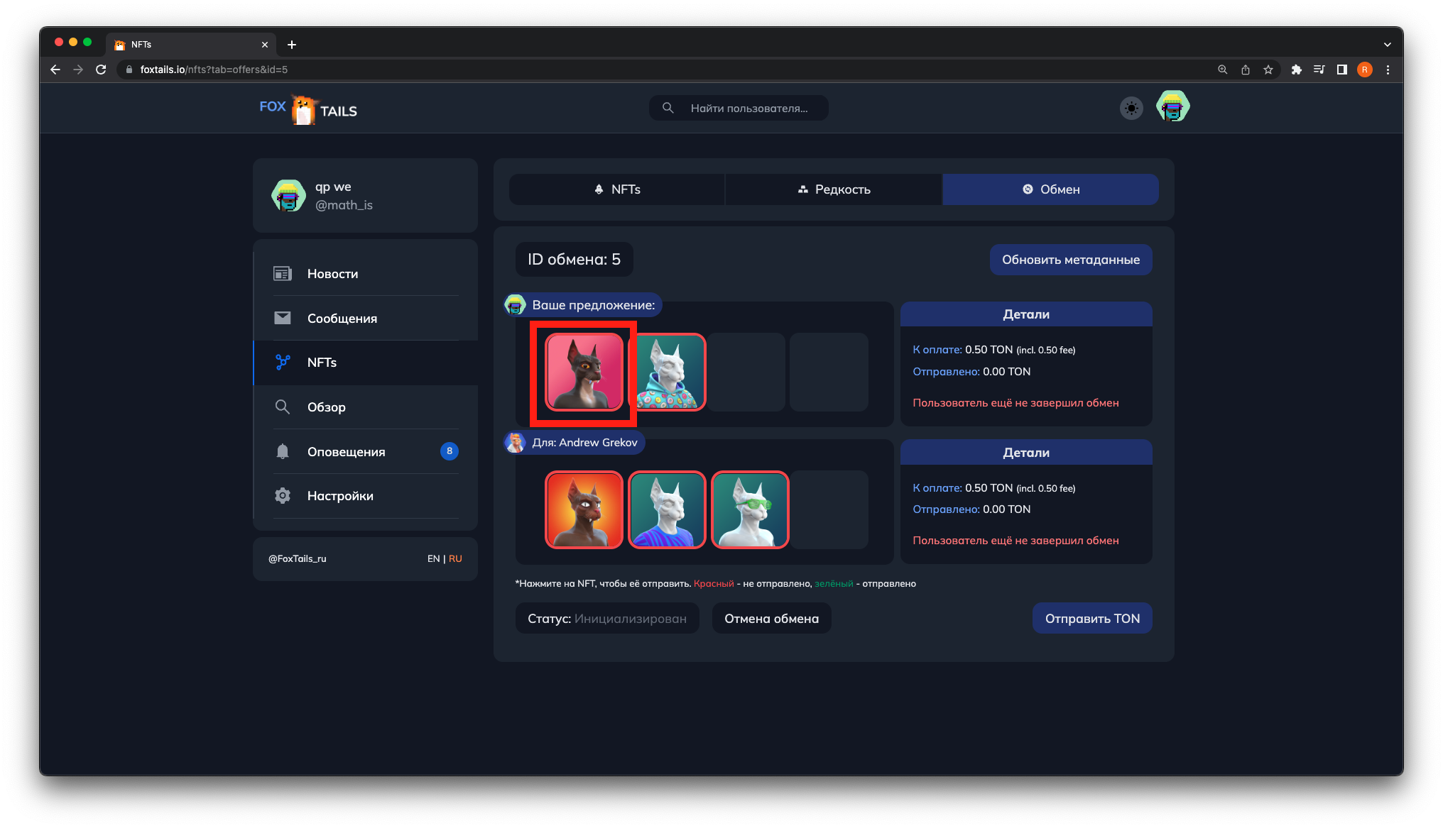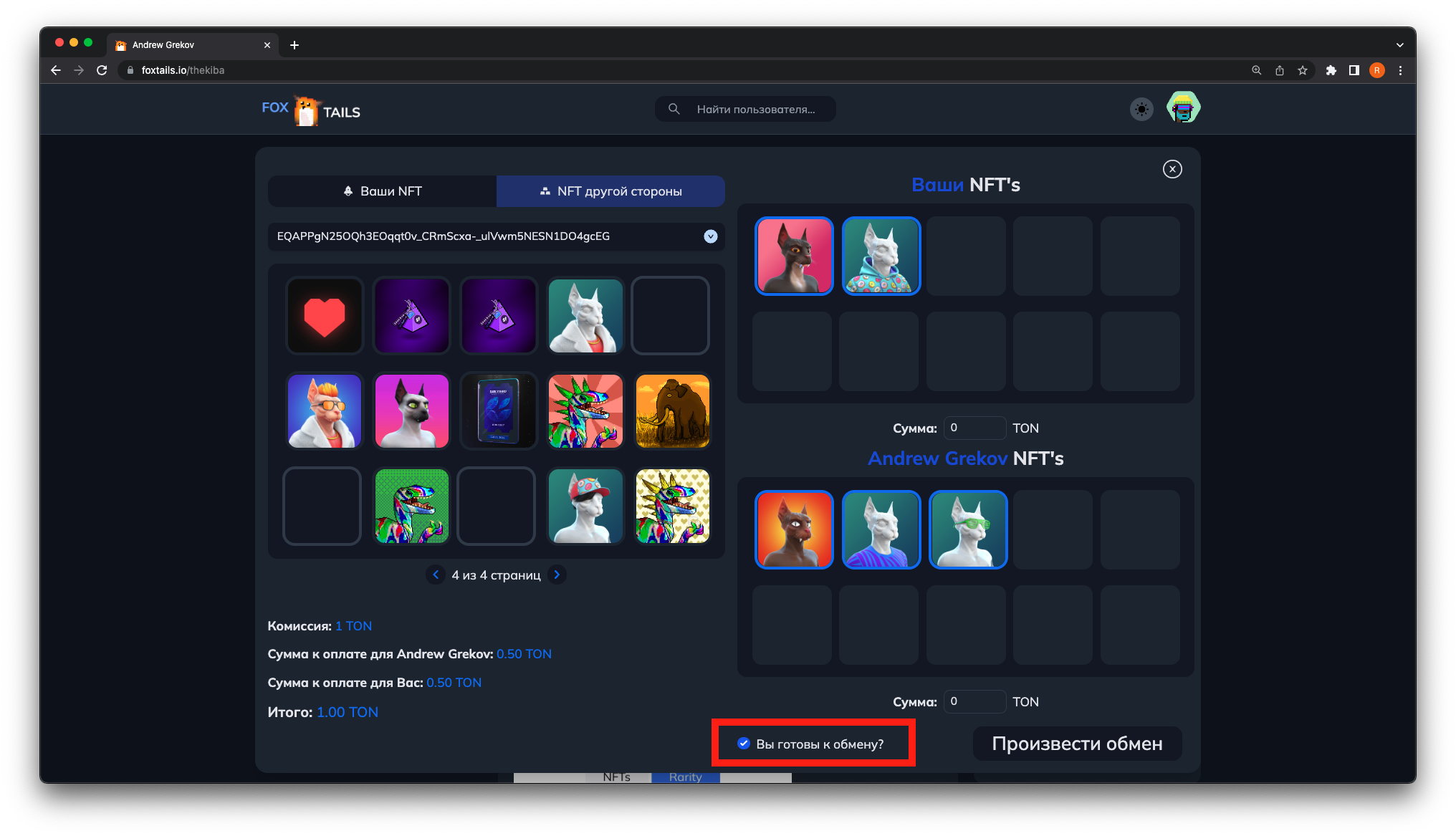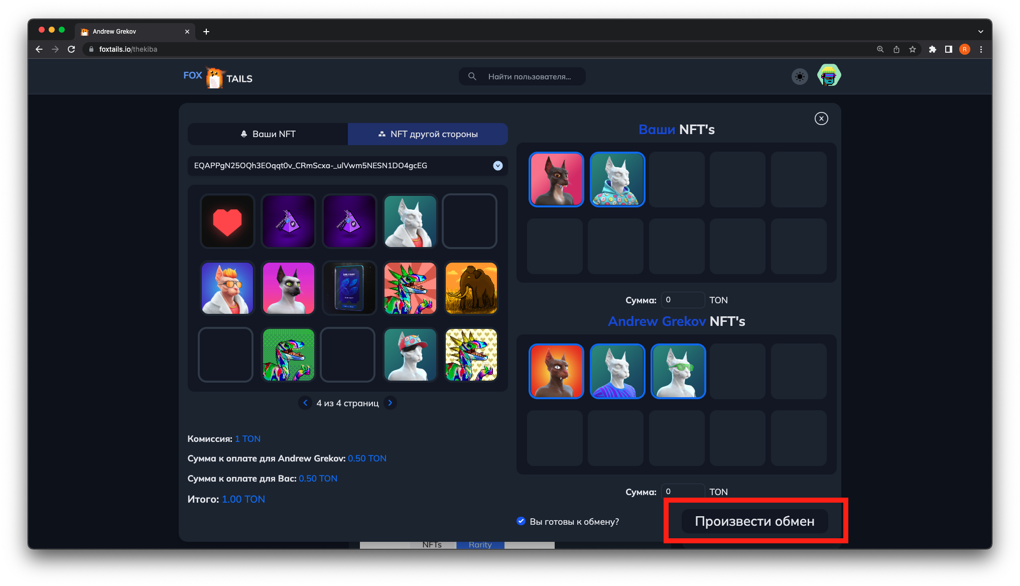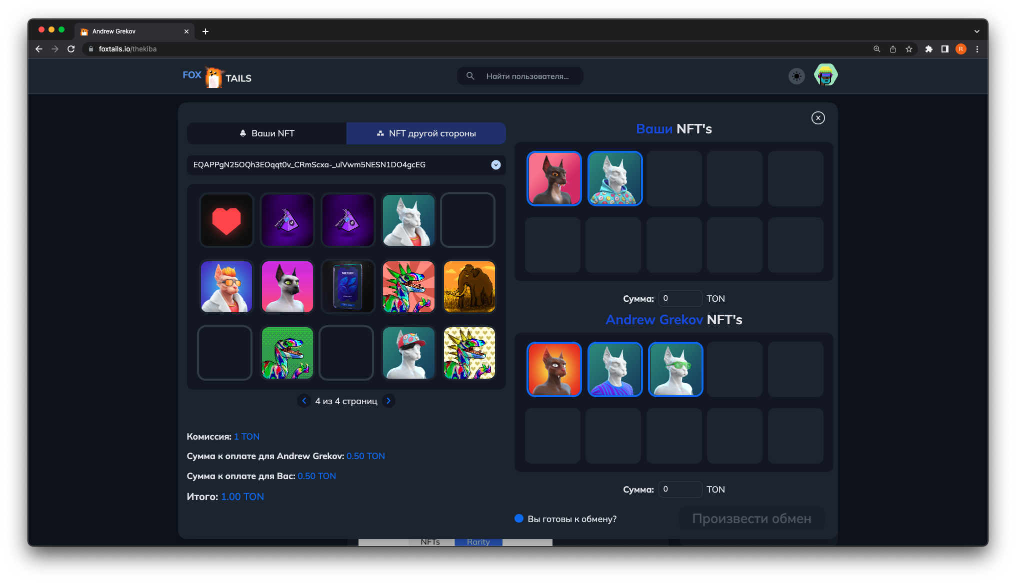 3. ΠΠΎΡΠ»Π΅ Π½Π°ΠΆΠ°ΡΠΈΡ ΠΎΡΠΊΡΠΎΠ΅ΡΡΡ ΠΌΠ΅Π½Ρ ΠΎΠ±ΠΌΠ΅Π½Π°. ΠΡΠ±Π΅ΡΠΈΡΠ΅ ΠΊΠΎΡΡΠ»Π΅ΠΊ ΠΈ NFT, ΠΊΠΎΡΠΎΡΡΠ΅ Π²Ρ Ρ ΠΎΡΠΈΡΠ΅ ΠΎΡΠΏΡΠ°Π²ΠΈΡΡ Π½Π° ΠΎΠ±ΠΌΠ΅Π½. Π’Π°ΠΊΠΆΠ΅ Ρ Π²Π°Ρ Π΅ΡΡΡ Π²ΠΎΠ·ΠΌΠΎΠΆΠ½ΠΎΡΡΡ ΡΠΊΠ°Π·Π°ΡΡ ΡΡΠΌΠΌΡ Π΄ΠΎΠΏΠ»Π°ΡΡ TON Π΄Π»Ρ Π»ΡΠ±ΠΎΠΉ ΠΈΠ· ΡΡΠΎΡΠΎΠ½.