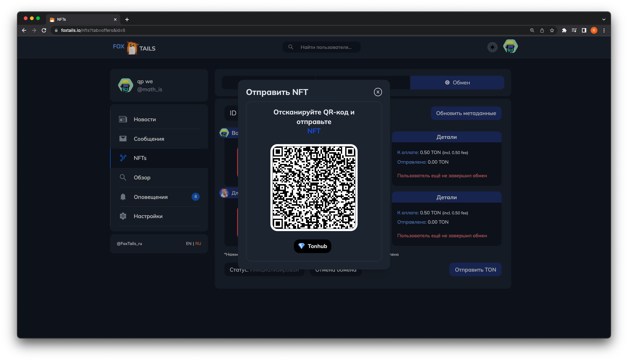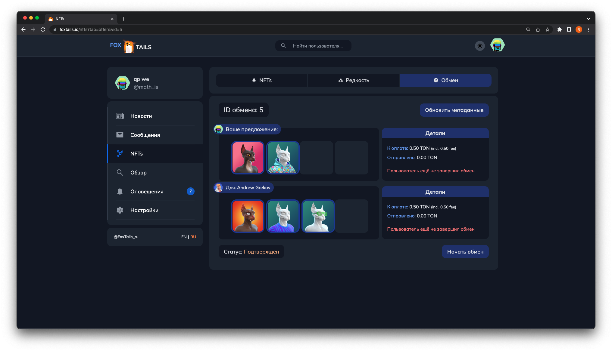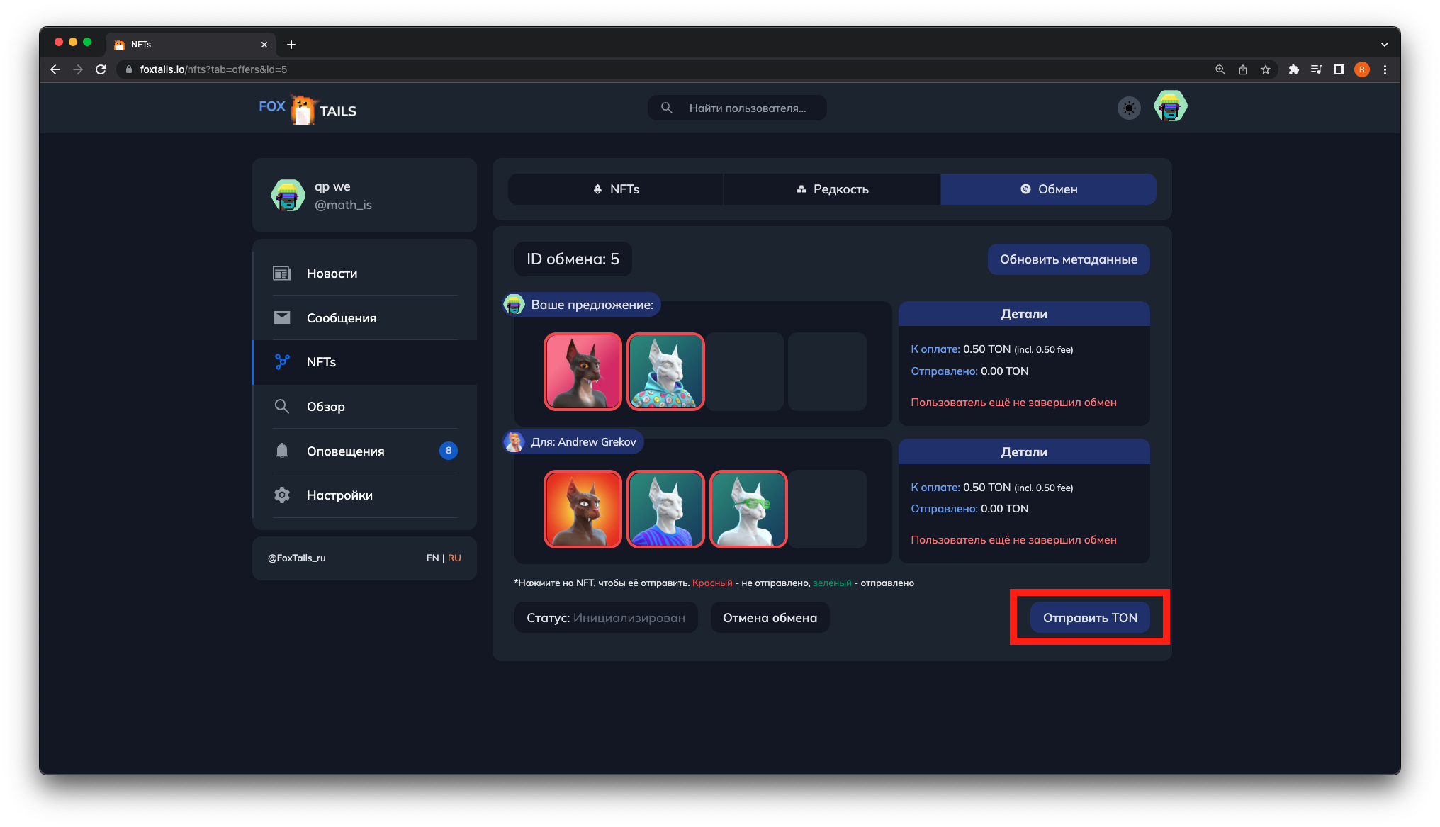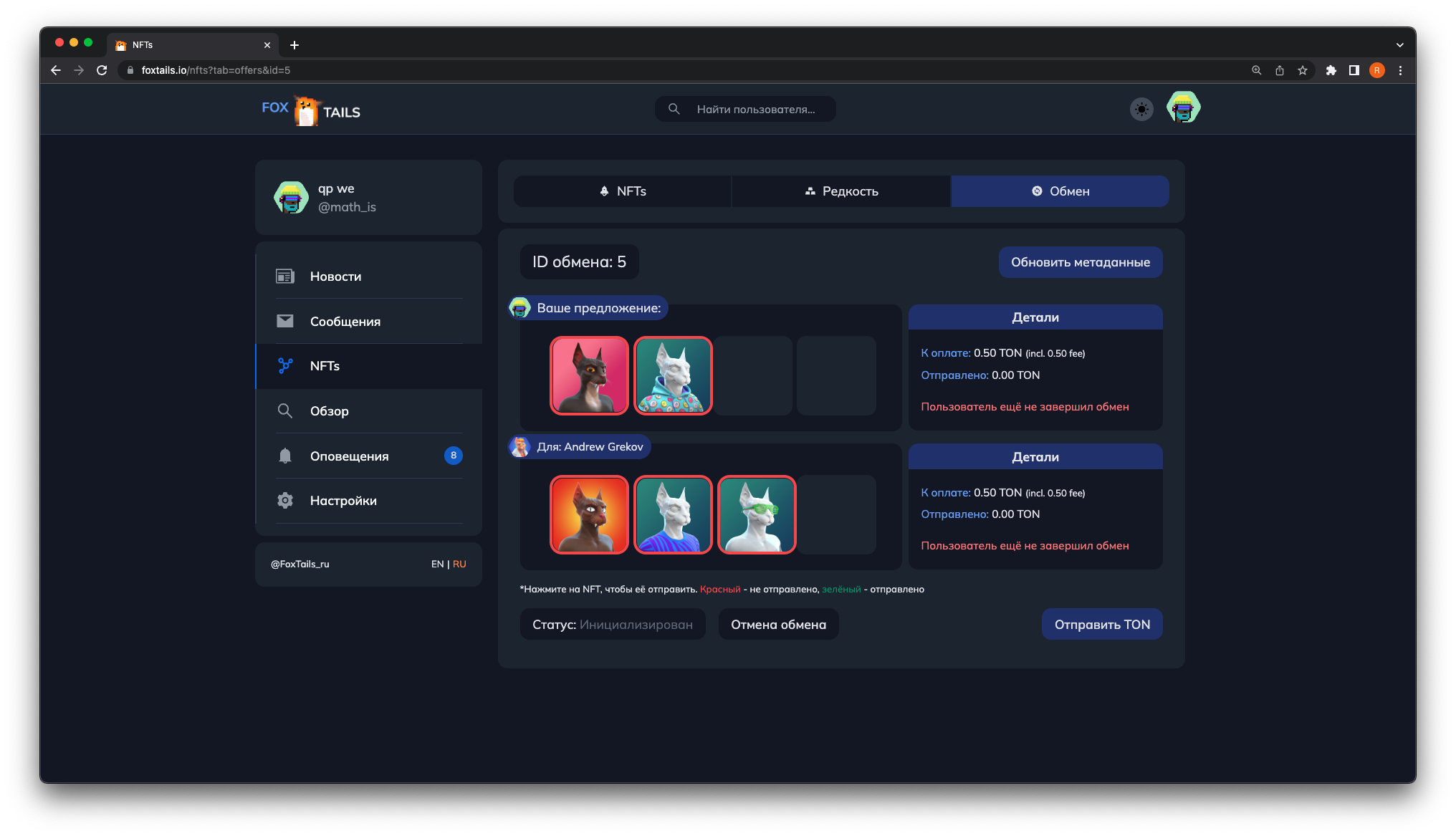 3. ΠΠΎΡΠ»Π΅ Π½Π°ΠΆΠ°ΡΠΈΡ ΠΎΡΠΊΡΠΎΠ΅ΡΡΡ ΠΌΠ΅Π½Ρ ΠΎΠ±ΠΌΠ΅Π½Π°. ΠΡΠ±Π΅ΡΠΈΡΠ΅ ΠΊΠΎΡΡΠ»Π΅ΠΊ ΠΈ NFT, ΠΊΠΎΡΠΎΡΡΠ΅ Π²Ρ Ρ ΠΎΡΠΈΡΠ΅ ΠΎΡΠΏΡΠ°Π²ΠΈΡΡ Π½Π° ΠΎΠ±ΠΌΠ΅Π½. Π’Π°ΠΊΠΆΠ΅ Ρ Π²Π°Ρ Π΅ΡΡΡ Π²ΠΎΠ·ΠΌΠΎΠΆΠ½ΠΎΡΡΡ ΡΠΊΠ°Π·Π°ΡΡ ΡΡΠΌΠΌΡ Π΄ΠΎΠΏΠ»Π°ΡΡ TON Π΄Π»Ρ Π»ΡΠ±ΠΎΠΉ ΠΈΠ· ΡΡΠΎΡΠΎΠ½.