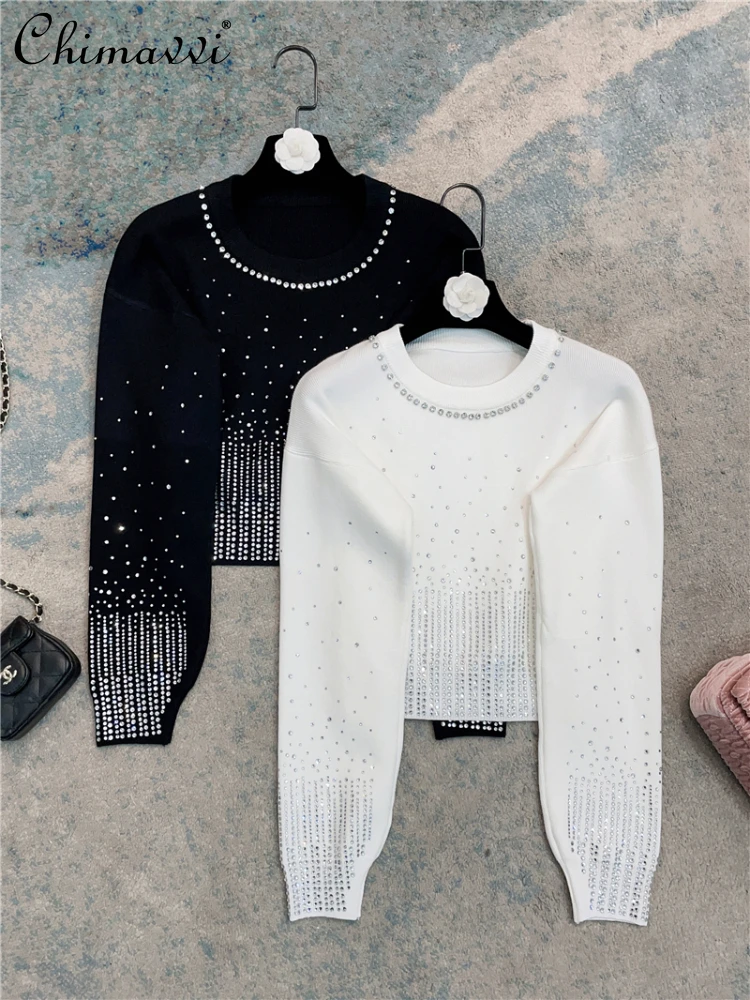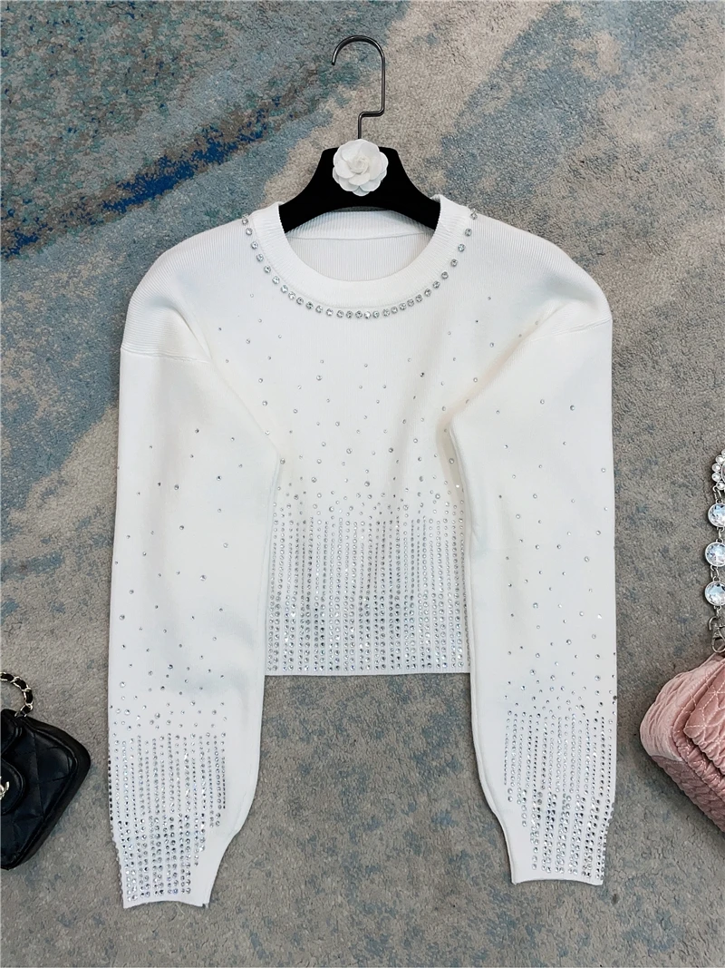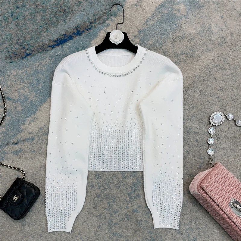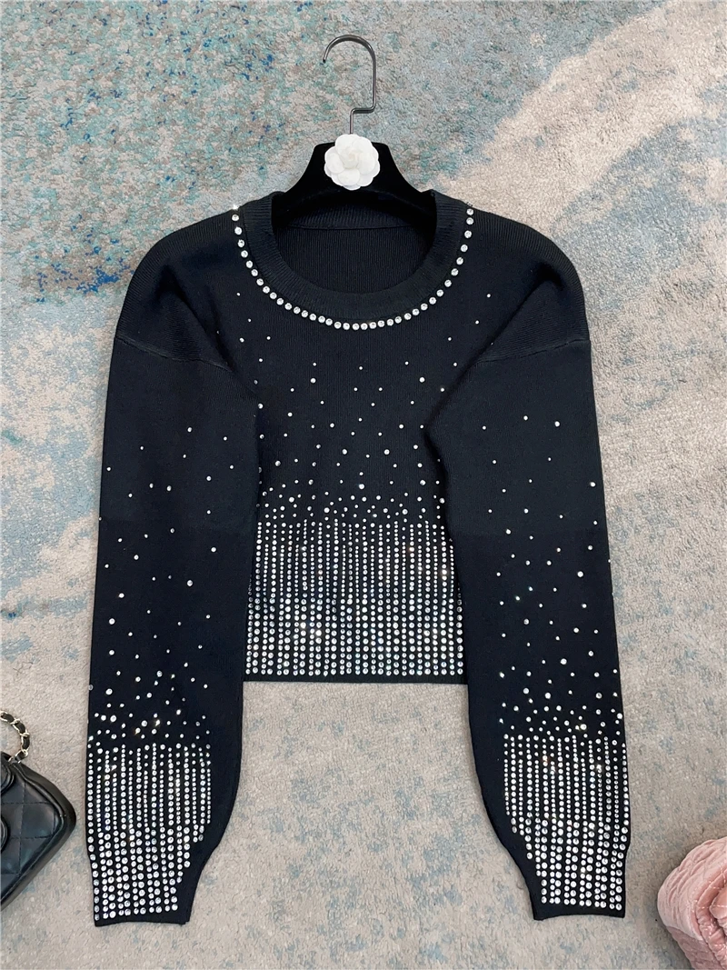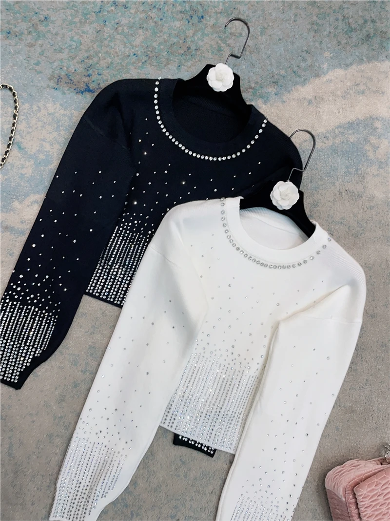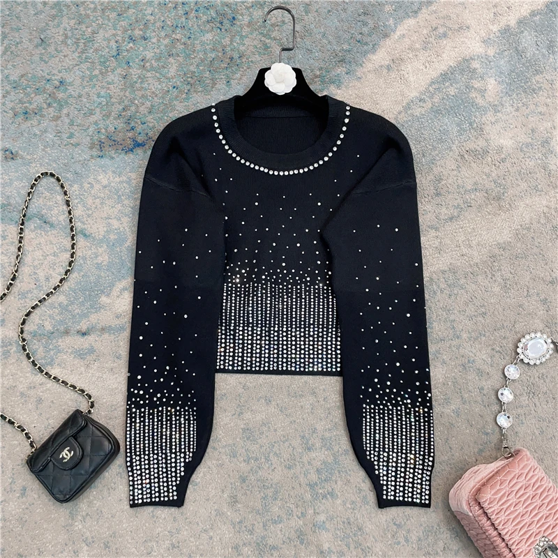 French Style Solid Color Long Sleeve Women's Sweater 2023 Autumn Winter Starry Rhinestone Beaded Slimming Short Pullover - Купить с бесплатной доставкой