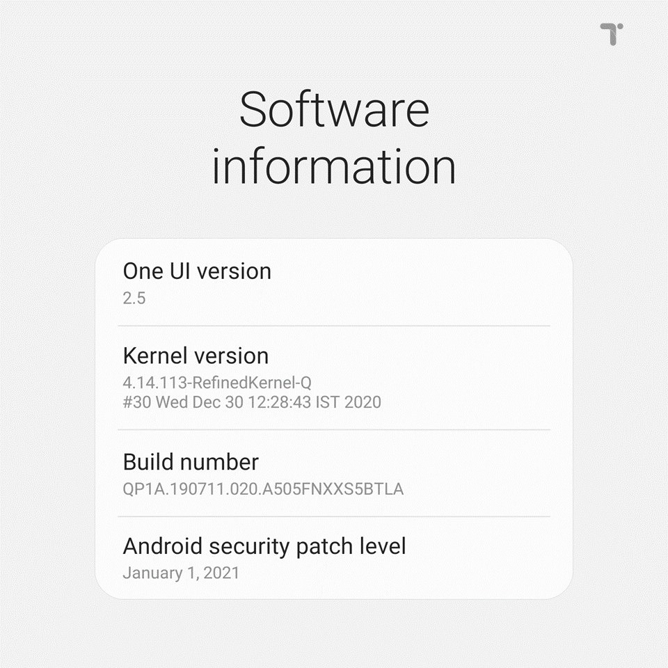 FreshROMs 11.5.1.2 includes the January 2021 security patches for the vendor, now based on A505FNXXU5BTLA (DBT). The system base is currently stuck on A507FNXXU5CTK3 (XTC) due to Samsung not bringing updates to the Galaxy A50s for the meantime.