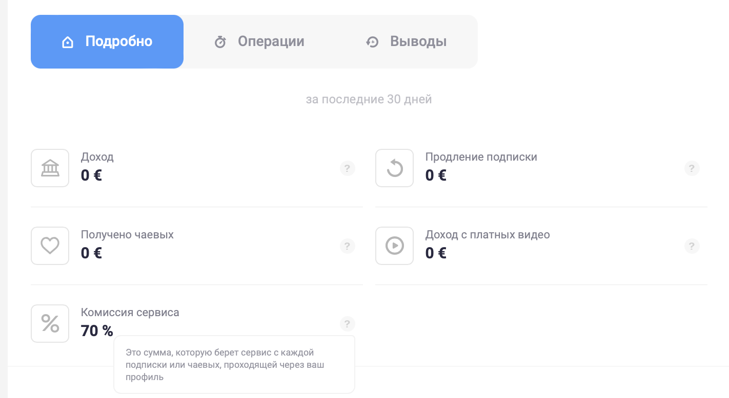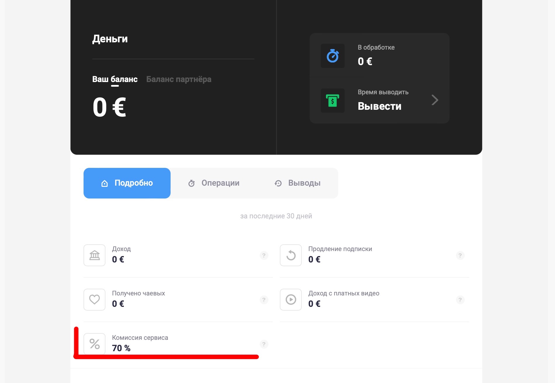 Раздел "Деньги". Очень интересный и важный раздел. В нём мы, например, узнаём, что сервис берёт 70% комиссии.