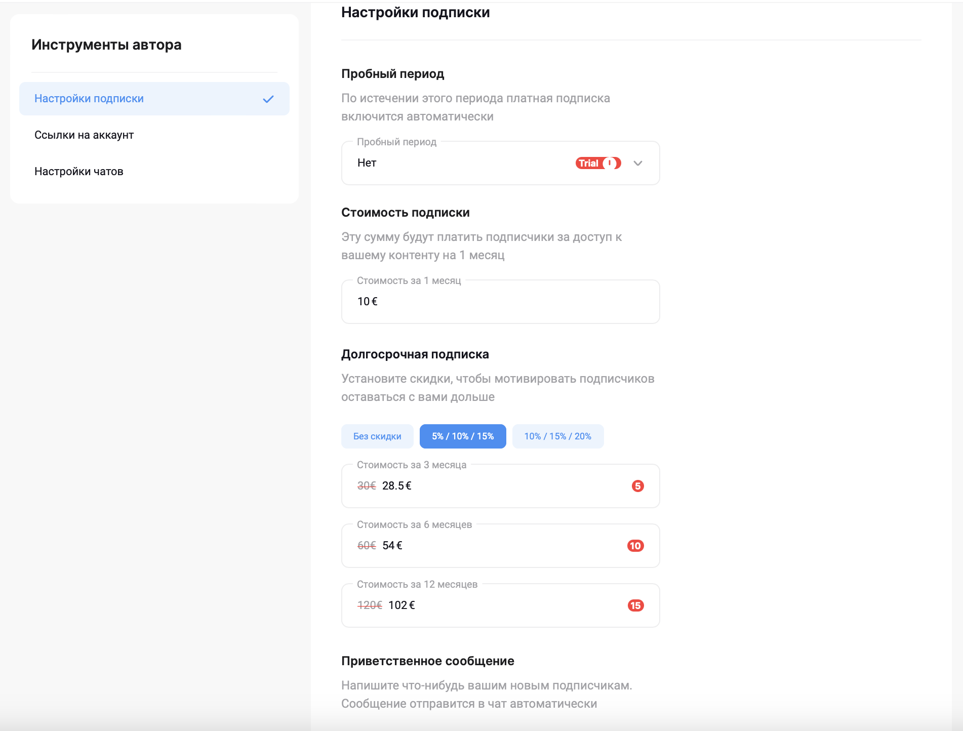 В разделе "Инструменты автора" по вкладке "Настройки подписки" вы найдёте самые важные настройки: