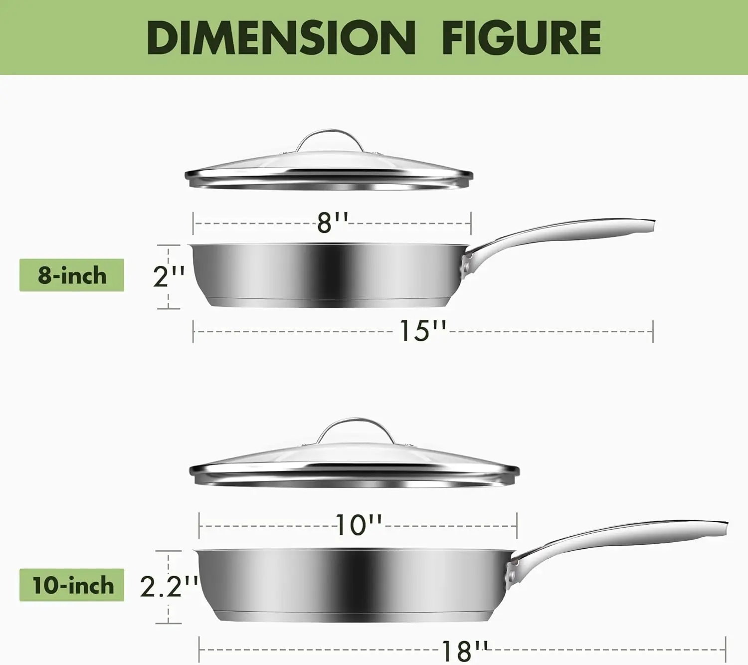 Frying Pan Skillet Set with Lids, 8 Inch & 10 Inch Stainless Steel Deep Chef Fry Pans with Ceramic Coating, Dishwasher & Molde p - Купить с бесплатной доставкой