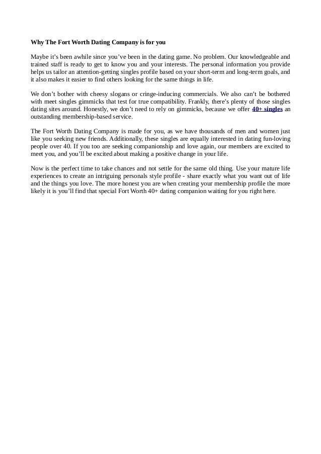 The Fort Worth Dating Company Special Dating Programs: Speed Dating and Singles Travel We separate ourselves from other dating websites because we are more than just a dating website . We go beyond the same old singles mixers and cheesy events to bring you a full-service company that works for you .