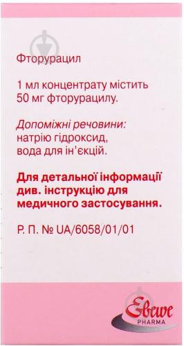 5-фторурацил эбеве концентрат для раствора для инфузий 50 мг / мл 10 мл (500 мг) флакон №1 ЕБЕВЕ Фарма Гес .м .б .Х Нфг .КГ, Австрія