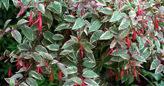 Фуксия 'Tom West' (Miellez, Fr, 1853) Кустовая и ампельная формы, бутоны удлиненные, цветки простые, яркого розово-красного цвета . Листья светло-зеленые с желто-розовой окантовкой .