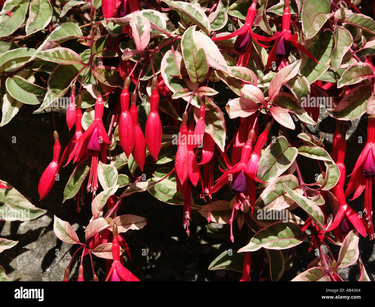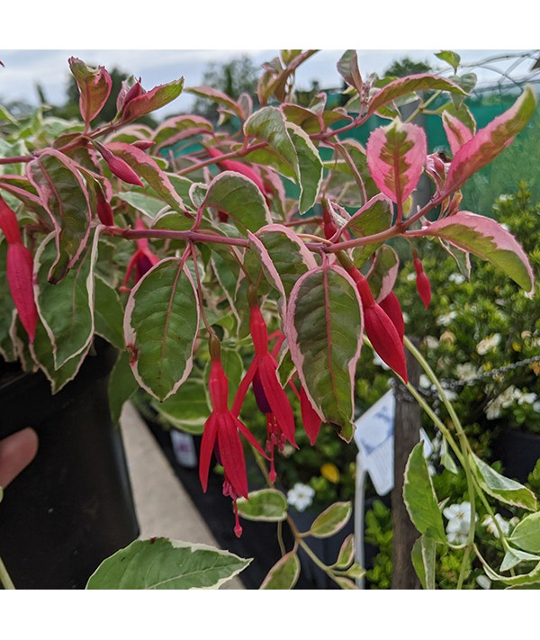 Tom West . Кустовая обильноцветущая самоветвящаяся фуксия с простыми мелкими цветами . Чашелистики красные, юбочка фиолетовая с ярко-красными мазками у основания . Небольшие листья очень декоративны: светло-зелёные с кремово-розовой окантовкой, с красными . . .