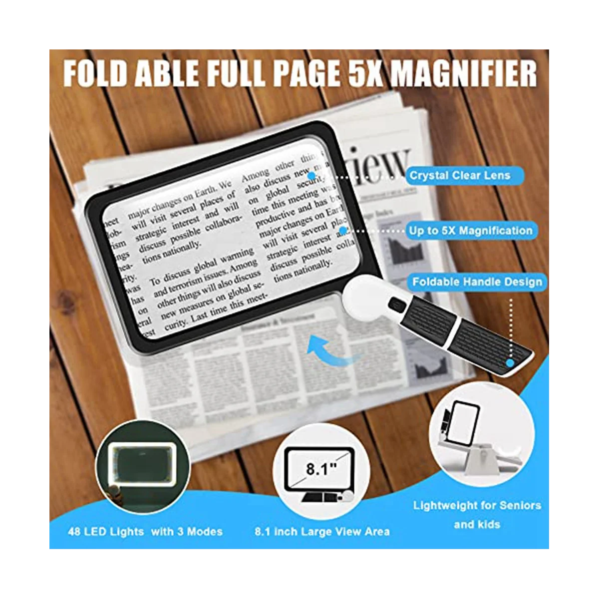 "Full-Page 5X Magnifying Glass for Reading, Folding Lighted Magnifier with 48 LED Lights, Rectangular Handhold Magnifier" * Buy Now With Free Shipping Just For $10