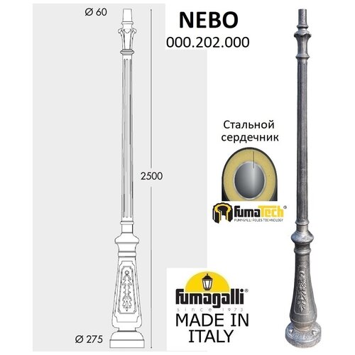 Poteau de parc FUMAGALLI, modèle NEBO. Support au sol d'une hauteur de 2500 mm pour un luminaire moyen et grand. Conception classique en « fonte », imitation des supports de parc en fonte du siècle avant-dernier. A la base du support se trouve une trappe d'installation pour les fils de connexion et d'alimentation. Le boîtier de montage n'est pas inclus dans le kit de livraison et est disponible en option. Le support est équipé de pièces encastrées à couler dans la fondation. Fabriqué selon la technologie FUMATECH, en utilisant des matériaux aux propriétés physiques différentes. Au centre du produit se trouve un tube en acier (galvanisé des deux côtés), qui garantit la solidité et la rigidité de la structure. À l'extérieur, on utilise un matériau polymère technologique très résistant, RÉSINE, qui protège la surface des effets agressifs de tous les facteurs atmosphériques (le revêtement ne rouille pas, ne se décolore pas au soleil et n'a pas peur des sels et des réactifs). L'espace entre ces matériaux est rempli sous haute pression de mousse de polyuréthane dense et non absorbante, qui relie fermement l'ensemble de la structure en un seul tout. Ne conduit pas l'électricité !!! Le lampadaire et les lampes ne nécessitent pas de mise à la terre et appartiennent à la classe de sécurité électrique 2. La taille de montage des lanternes et des consoles de lampadaires est de 60 mm. La durée de vie est d'au moins 20 ans. Utilisez une température de -60 à +90.Poteau de parc FUMAGALLI, modèle NEBO. Support au sol d'une hauteur de 2500 mm pour un luminaire moyen et grand. Conception classique en « fonte », imitation des supports de parc en fonte du siècle avant-dernier. A la base du support se trouve une trappe d'installation pour les fils de connexion et d'alimentation. Le boîtier de montage n'est pas inclus dans le kit de livraison et est disponible en option. Le support est équipé de pièces encastrées à couler dans la fondation.