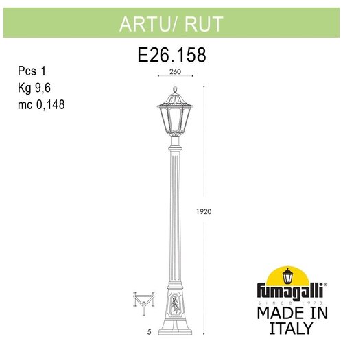 Lanterne paysagère série FUMAGALLI RUT, modèle RUT,/ARTU. Lampadaire Park, mât ARTU avec un lampadaire RUT,. Utilisé pour l'éclairage architectural et paysager de style classique. Le lieu d'installation des mâts d'éclairage est les allées des parcs, les trottoirs, les pelouses des parcs et des places, ainsi que les objets paysagers et architecturaux. Fabriqué en Italie en utilisant les technologies FUMAGALLI uniques à partir de RÉSINE polymère composite moderne. Ce matériau est 5 fois plus résistant que le métal, ne rouille pas, ne s'oxyde pas, ne se décolore pas au soleil et n'a pas besoin d'être peint. Toutes les lampes sont protégées contre la poussière et l'humidité selon la norme IP55 (Dustproof, protégée des jets d'eau venant de toutes directions). Le diffuseur est en PMMA (PolyMéthylMetaAcrylate) anti-vandale, non turbidité et ininflammable. La durée de vie de la lampe est d'au moins 20 ans. Utilisez une température de -60 à +90. La série GLOBE 300 comprend des lanternes en version murale (BISSO/ RUT, OFIR/ RUT, MIRRA/ RUT, PORPORA/ RUT), suspendue (SICHEM/ RUT) et au sol (MINILOT/ RUT, MIZAR.R/ RUT, IAFAET.R/ RUT , ALOE.R/ RUT, ARTU/ RUT, GIGI/ RUT, RICU/ RUT, RICU/ISSO/ RUT 2L, NEBO/ RUT, NEBO OFIR/ RUT 2L, NEBO OFIR/ RUT 3L) avec piliers de différentes hauteurs, avec différents nombres et configurations de tête. Les consoles pour lanternes murales et les supports de lampes sur poteaux d'éclairage peuvent être installés vers le haut/bas. Les piliers de plus de 150 cm reposent sur un puissant tube en acier doublement galvanisé. Lors de la commande, vous devez sélectionner la couleur du corps, la couleur de l'abat-jour et le type de douille. En termes de style et de design, la série de lampadaires RUT est similaire aux lampes de petite taille de la série ANNA et aux lampes de grande taille de la série NOEMI. En termes de taille, RUT appartient aux luminaires de taille moyenne comme les séries CEFA, SALEM et GLOBE 300.Couleur du luminaire : Cuivre antique Hauteur : 1920 mm Nombre de lampes : 1 Culot : E27 Surface d'éclairage : 220