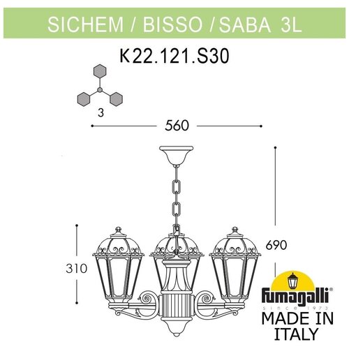 Lampadaire suspendu série FUMAGALLI SABA, modèle SABA/SICHEM 3L. Suspension - lustre à trois bras de trois lanternes SABA sur petites consoles BISSO, suspendues à une chaîne SICHEM. Utilisé pour l'éclairage architectural et décoratif de style classique. Le lieu d'installation des lustres extérieurs est les arches, les galeries, les belvédères de jardin, les vérandas, les loggias et autres endroits où l'installation de lanternes suspendues est requise et possible. Peut être installé à l'intérieur dans n'importe quelle pièce comme lampe principale ou décorative. Fabriqué en Italie en utilisant les technologies FUMAGALLI uniques à partir de RÉSINE polymère composite moderne. Ce matériau est 5 fois plus résistant que le métal, ne rouille pas, ne s'oxyde pas, ne se décolore pas au soleil et n'a pas besoin d'être peint. Toutes les lampes sont protégées contre la poussière et l'humidité selon la norme IP44 (protection contre les particules solides supérieures à 1 mm, protection contre les chutes ou éclaboussures tombant sous n'importe quel angle). Le diffuseur est en PMMA (PolyMéthylMetaAcrylate) anti-vandale, non turbidité et ininflammable. La durée de vie de la lampe est d'au moins 20 ans. Utilisez une température de -60 à +90. La série SABA comprend des lanternes en version murale (BISSO/SABA, PORPORA/SABA), suspendue (SICHEM/SABA) et au sol (IAFAET.R/SABA, ALOE.R/SABA, ARTU/SABA, GIGI/SABA , RICU/SABA, RICU/ISSO/SABA 1L, RICU/ISSO/SABA 2L, RICU/ISSO/SABA 3L) avec des piliers de différentes hauteurs, avec différents nombres et configurations de têtes. Les consoles de lanternes murales et les supports de luminaires pour poteaux lumineux peuvent être installés vers le haut/vers le bas. Les piliers de plus de 150 cm reposent sur un puissant tube en acier doublement galvanisé. Lors de la commande, vous devez sélectionner la couleur du corps, la couleur de l'abat-jour et le type de douille. Une version LED avec douille GX-53 est possible. En termes de style et de design, la série de lampadaires SABA est similaire aux lampes de taille moyenne de la série SALEM et aux lampes de grande taille de la série SILOE. En termes de taille, SABA appartient aux petits luminaires comme les séries ANNA et GLOBE 250.