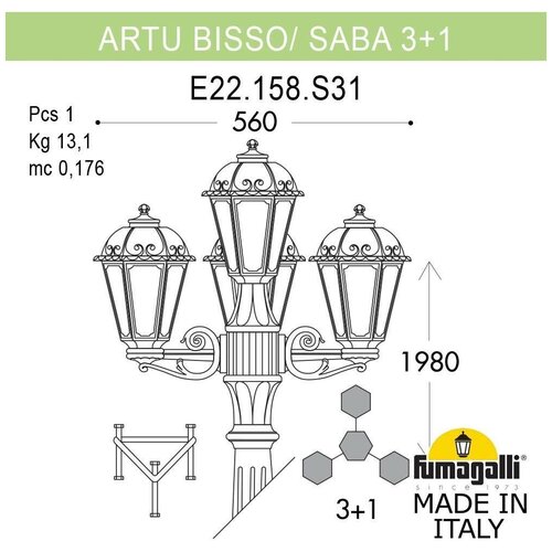 Lanterne paysagère série FUMAGALLI SABA, modèle SABA /ARTU/BISSO 3+1. Lampadaire Park, mât ARTU composé de trois lampadaires SABA sur trois petites consoles BISSO et d'une quatrième lampe sur mât. Utilisé pour l'éclairage architectural et paysager de style classique. Les lieux d'installation des poteaux d'éclairage sont les allées des parcs, les places, les parcelles de jardin, les trottoirs, ainsi que les objets paysagers et architecturaux. Ils peuvent également être installés à l’intérieur comme lampadaires décoratifs. Fabriqué en Italie en utilisant les technologies FUMAGALLI uniques à partir de RÉSINE polymère composite moderne. Ce matériau est 5 fois plus résistant que le métal, ne rouille pas, ne s'oxyde pas, ne se décolore pas au soleil et n'a pas besoin d'être peint. Toutes les lampes sont protégées contre la poussière et l'humidité selon la norme IP44 (protection contre les particules solides supérieures à 1 mm, protection contre les chutes ou éclaboussures tombant sous n'importe quel angle). Le diffuseur est en PMMA (PolyMéthylMetaAcrylate) anti-vandale, non turbidité et ininflammable. La durée de vie de la lampe est d'au moins 20 ans. Utilisez une température de -60 à +90. La série SABA comprend des lanternes en version murale (BISSO/SABA, PORPORA/SABA), suspendue (SICHEM/SABA, SICHEM/SABA 3L) et au sol (IAFAET.R/SABA, ALOE.R/SABA, ARTU/SABA, GIGI/ SABA , RICU/SABA, RICU/ISSO/SABA 1L, RICU/ISSO/SABA 2L, RICU/ISSO/SABA 3L) avec des piliers de différentes hauteurs, avec différents nombres et configurations de têtes. Les consoles de lanternes murales et les supports de luminaires pour poteaux lumineux peuvent être installés vers le haut/vers le bas. Les piliers de plus de 150 cm reposent sur un puissant tube en acier doublement galvanisé. Lors de la commande, vous devez sélectionner la couleur du corps, la couleur de l'abat-jour et le type de douille. Une version LED avec douille GX-53 est possible. En termes de style et de design, la série de lampadaires SABA est similaire aux lampes de taille moyenne de la série SALEM et aux lampes de grande taille de la série SILOE. En termes de taille, SABA appartient aux petits luminaires comme les séries ANNA et GLOBE 250.