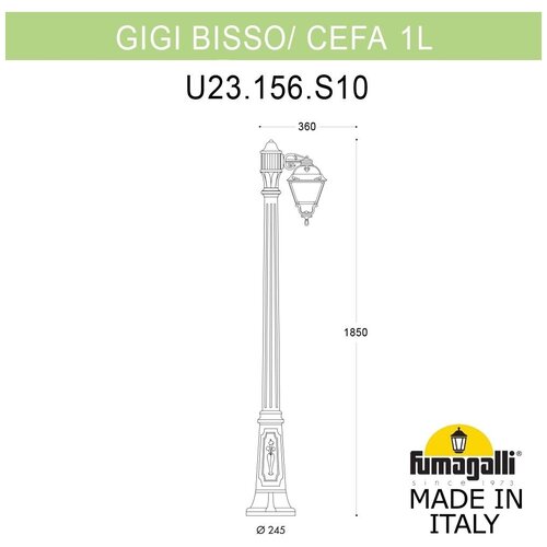 Lanterne paysagère série FUMAGALLI CEFA, modèle CEFA/GIGI/BISSO 1L. Lampadaire Park, mât GIGI avec un lampadaire CEFA monté « vers le bas » sur une petite console BISSO. Utilisé pour l'éclairage architectural et paysager de style classique. Les lieux d'installation des poteaux lumineux sont les villages de chalets, les allées des parcs, les chalets d'été, les trottoirs, les pelouses des parcs et des places, ainsi que les objets paysagers et architecturaux. Fabriqué en Italie en utilisant les technologies FUMAGALLI uniques à partir de RÉSINE polymère composite moderne. Ce matériau est 5 fois plus résistant que le métal, ne rouille pas, ne s'oxyde pas, ne se décolore pas au soleil et n'a pas besoin d'être peint. Toutes les lampes sont protégées contre la poussière et l'humidité selon la norme IP55 (Dustproof, protégée des jets d'eau venant de toutes directions). Le kit comprend des fixations et des éléments de montage. Le diffuseur est en PMMA (PolyMéthylMetaAcrylate) anti-vandale, non turbidité et ininflammable. La durée de vie de la lampe est d'au moins 20 ans. Utilisez une température de -60 à +90. La série GLOBE 300 comprend des lanternes en version murale (BISSO/CEFA, OFIR/CEFA, MIRRA/CEFA, PORPORA/CEFA), suspendue (SICHEM/CEFA) et au sol (MINILOT/CEFA, MIZAR.R/CEFA, IAFAET.R/CEFA , ALOE.R/CEFA, ARTU/CEFA, GIGI/CEFA, RICU/CEFA, RICU/ISSO/CEFA 2L, NEBO/CEFA, NEBO OFIR/CEFA 2L, NEBO OFIR/CEFA 3L) avec piliers de différentes hauteurs, avec différents nombres et configurations de tête. Les consoles pour lanternes murales et les supports de lampes sur poteaux d'éclairage peuvent être installés vers le haut ou vers le bas. Les piliers de plus de 150 cm reposent sur un puissant tube en acier doublement galvanisé. Lors de la commande, vous devez sélectionner la couleur du corps, la couleur de l'abat-jour et le type de douille. Dans le style et le design, la série de lampadaires CEFA est similaire aux grandes lampes SIMON et aux très grandes lampes (Grand) PIETRO. En termes de taille, CEFA appartient aux luminaires de taille moyenne comme les séries RUT, SALEM et GLOBE 300.Lanterne paysagère série FUMAGALLI CEFA, modèle CEFA/GIGI/BISSO 1L. Lampadaire Park, mât GIGI avec un lampadaire CEFA monté « vers le bas » sur une petite console BISSO. Utilisé pour l'éclairage architectural et paysager de style classique. Les lieux d'installation des poteaux lumineux sont les villages de chalets, les allées des parcs, les chalets d'été, les trottoirs, les pelouses des parcs et des places, ainsi que les objets paysagers et architecturaux.