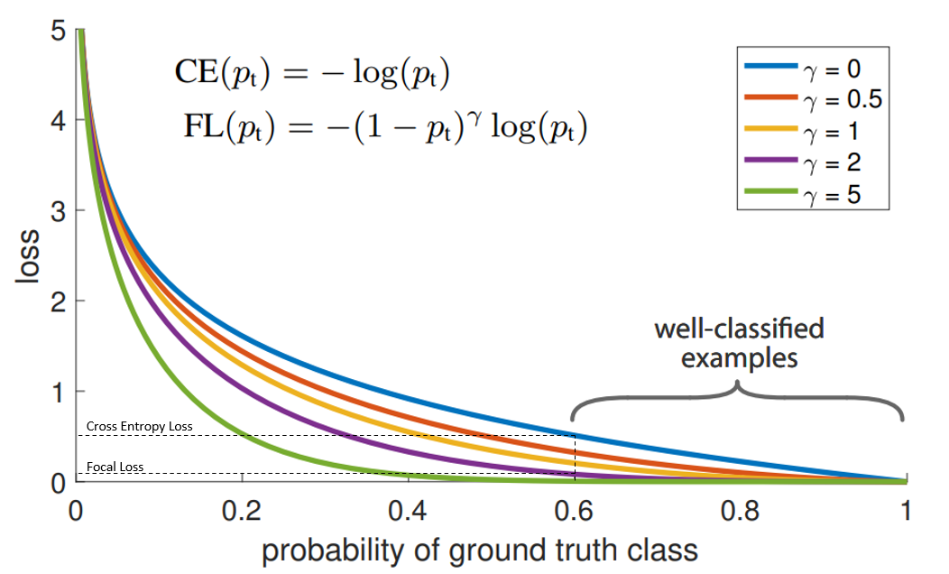 Focal Loss крут тем, что он решает проблему добавлением всего одного множителя! И теперь веса подбираются динамически для каждого объекта, исходя из уверенности в предсказании верного класса. Если из-за дисбаланса мы изначально плохо справляемся с объектами минорного класса, FL будет давать им больший лосс, но когда сеть начнет хорошо с ними справляться, то вес не будет “завышен”. Гиперпараметр гамма отвечает за то, какую уверенность считать достаточной, но зачастую можно оставить дефолтное значение gamma = 2.
