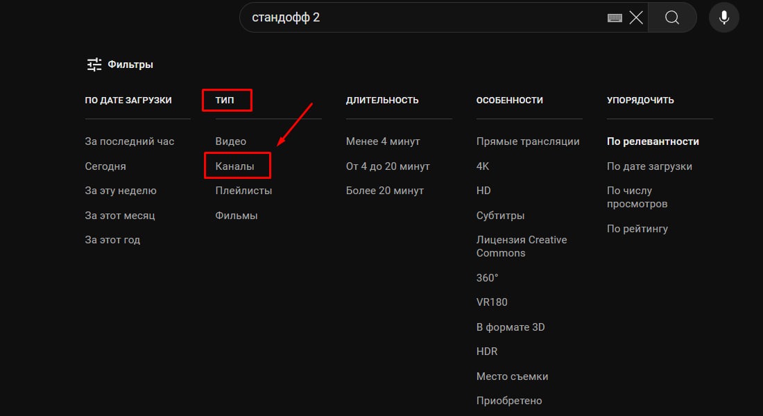 Пишем в поиске любое слово, в фильтрах выбираем ТИП Каналы