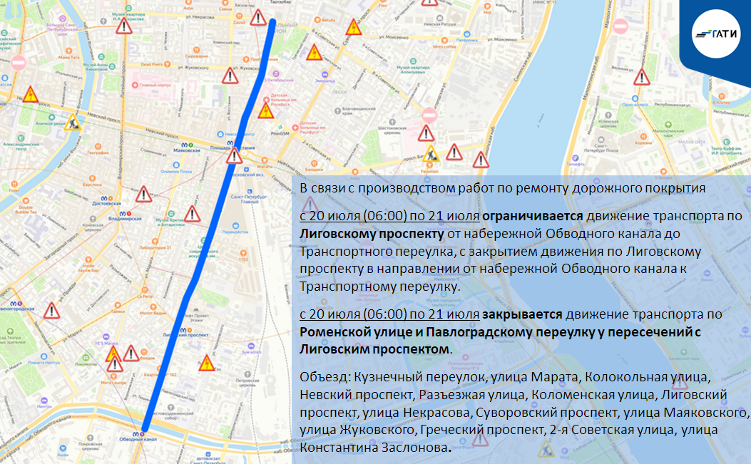 с 20 июля (06:00) по 21 июля ограничивается движение транспорта по Лиговскому проспекту от набережной Обводного канала до Транспортного переулка, с закрытием движения по Лиговскому проспекту в направлении от набережной Обводного канала к Транспортному переулку.