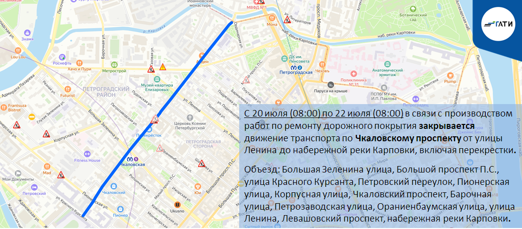 С 20 июля (08:00) по 22 июля (08:00) в связи с производством работ по ремонту дорожного покрытия закрывается движение транспорта по Чкаловскому проспекту от улицы Ленина до набережной реки Карповки, включая перекрестки.