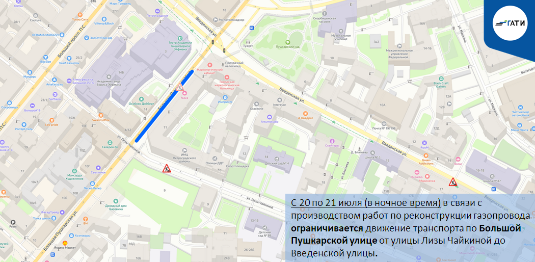 С 20 по 21 июля (в ночное время) в связи с производством работ по реконструкции газопровода ограничивается движение транспорта по Большой Пушкарской улице от улицы Лизы Чайкиной до Введенской улицы.