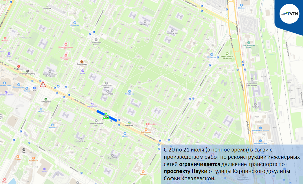 С 20 по 21 июля (в ночное время) в связи с производством работ по реконструкции инженерных сетей ограничивается движение транспорта по проспекту Науки от улицы Карпинского до улицы Софьи Ковалевской.