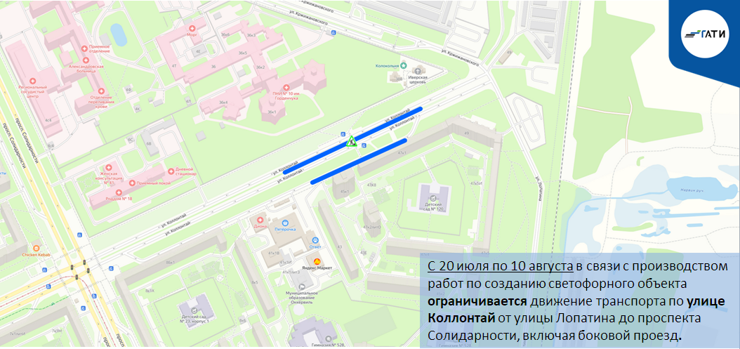 С 20 июля по 10 августа в связи с производством работ по созданию светофорного объекта ограничивается движение транспорта по улице Коллонтай от улицы Лопатина до проспекта Солидарности, включая боковой проезд.