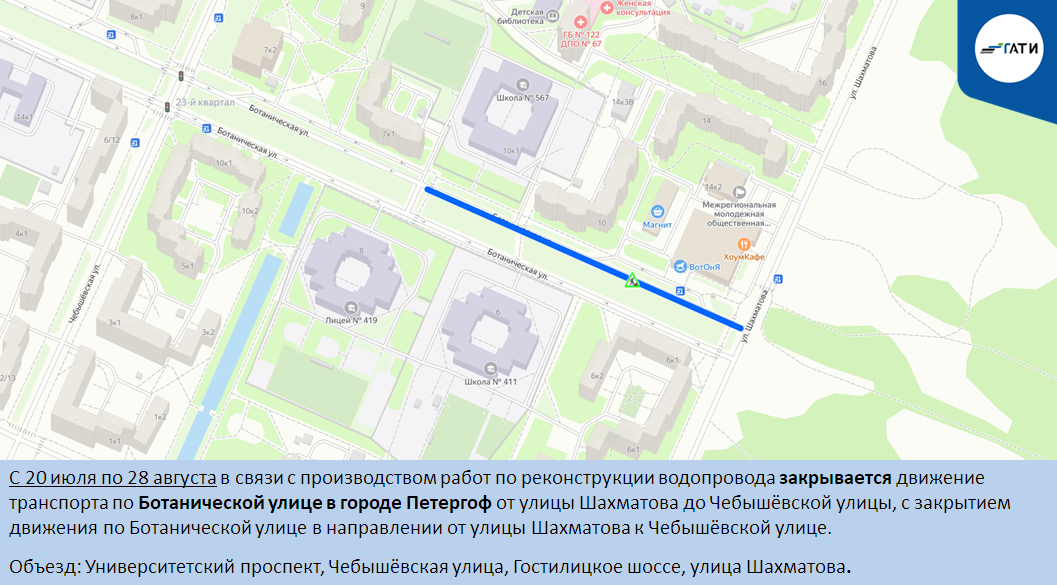 С 20 июля по 28 августа в связи с производством работ по реконструкции водопровода закрывается движение транспорта по Ботанической улице в городе Петергоф от улицы Шахматова до Чебышёвской улицы, с закрытием движения по Ботанической улице в направлении от улицы Шахматова к Чебышёвской улице.