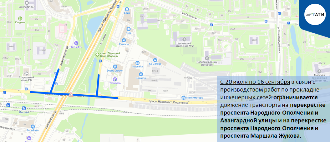 С 20 июля по 16 сентября в связи с производством работ по прокладке инженерных сетей ограничивается движение транспорта на перекрестке проспекта Народного Ополчения и Авангардной улицы и на перекрестке проспекта Народного Ополчения и проспекта Маршала Жукова.