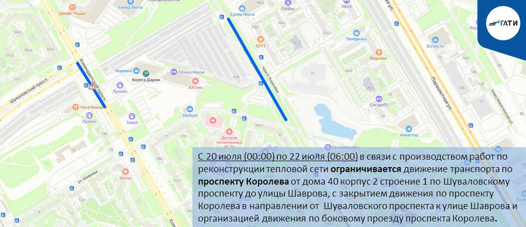 С 20 июля (00:00) по 22 июля (06:00) в связи с производством работ по реконструкции тепловой сети ограничивается движение транспорта по проспекту Королева от дома 40 корпус 2 строение 1 по Шуваловскому проспекту до улицы Шаврова, с закрытием движения по проспекту Королева в направлении от Шуваловского проспекта к улице Шаврова и организацией движения по боковому проезду проспекта Королева.