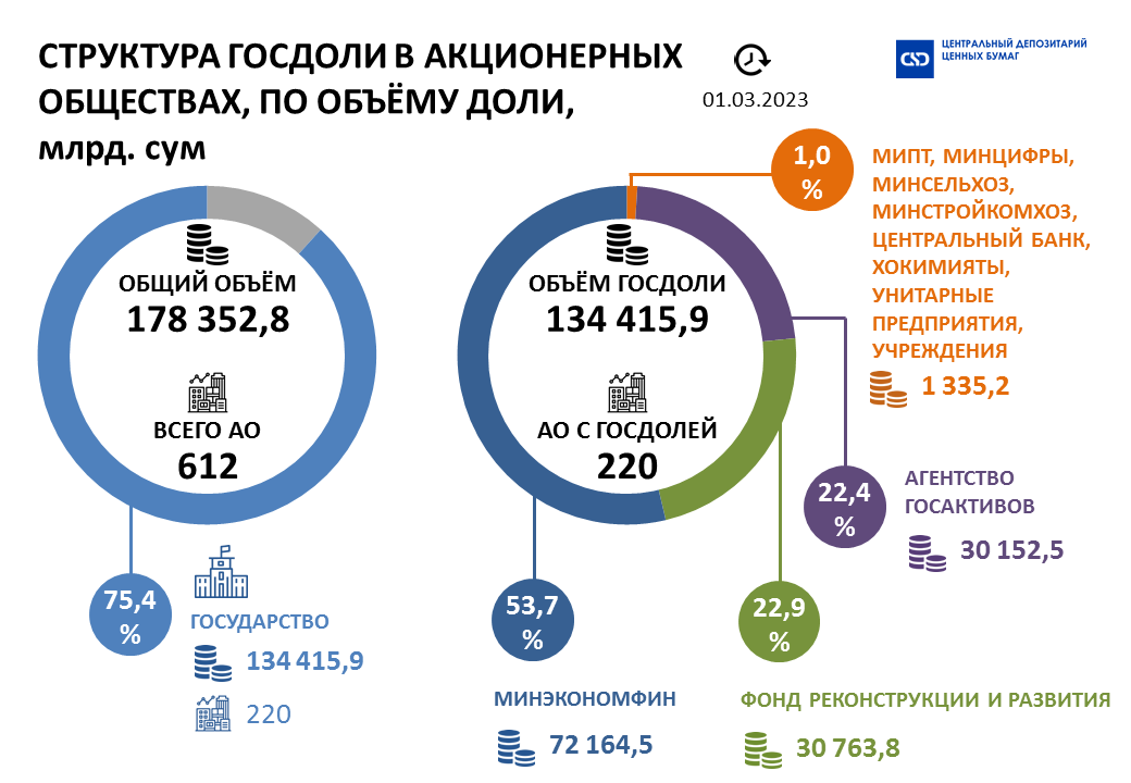 По итогам февраля 2023 года значительное изменение зафиксировано в долях Минэкономфина и Агентства госактивов, что связано с переходом к Агентству госактивов от Минэкономфина уставных капиталов целого ряда АО на общую сумму 21 142,9 млрд. сум или 15,7 % от общего объёма выпусков акций.