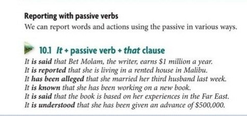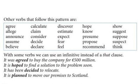 GRAMMARReporting with passive verbs ๐ The verbs in the box can use infinitive = (to + verb without any ) instead of "that" clause.